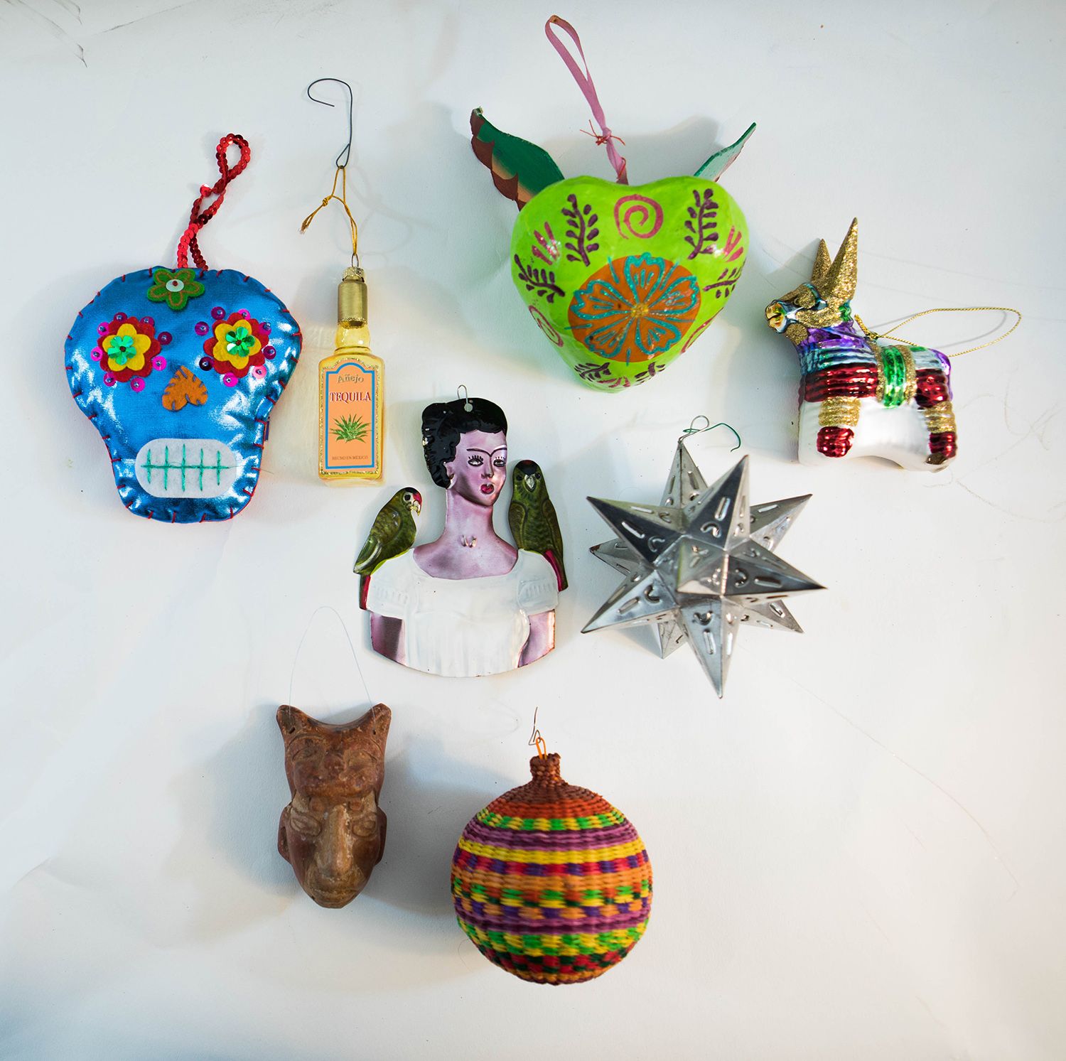 I don’t specifically set out to find ornaments for the Christmas tree while I’m on a trip, but they often appear to me while browsing in bustling souks, street fairs, boutiques and airport gift shops. Sometimes the items I buy aren’t intended for holiday displays, but find their way onto the branches of the Christmas tree anyway. A traditional seed shaker musical instrument from Colombia hangs within reach for impromptu musical performances. The etched-metallic hamsa I found in a Moroccan market wards off evil, allowing only the holiday spirit to enter our home. A mobile phone charm depicting a dumpling from the famous restaurant Din Tai Fun at the base of Taipei 101 brings back memories of a cultural phenomenon that was all the rage in Asia at the time, but didn’t really catch on in the United States. Instead of taking up space in the headphone jack of my phone, the charm dangles between the Sydney Opera House and the tin-cut ornament of Frida Kahlo.